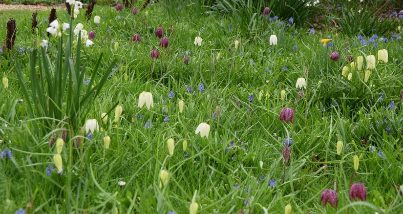At Fullers Mill Garden, leaves are opening on the trees, buds have already formed on the peonies promising an abundance of flowers, the herbaceous perennials are shooting up from the ground and our Fritillaria meleagris are opening by the millpond. This is all under the canopies of flowering cherries and magnolias, and of course the vibrant green new leaves which have opened.